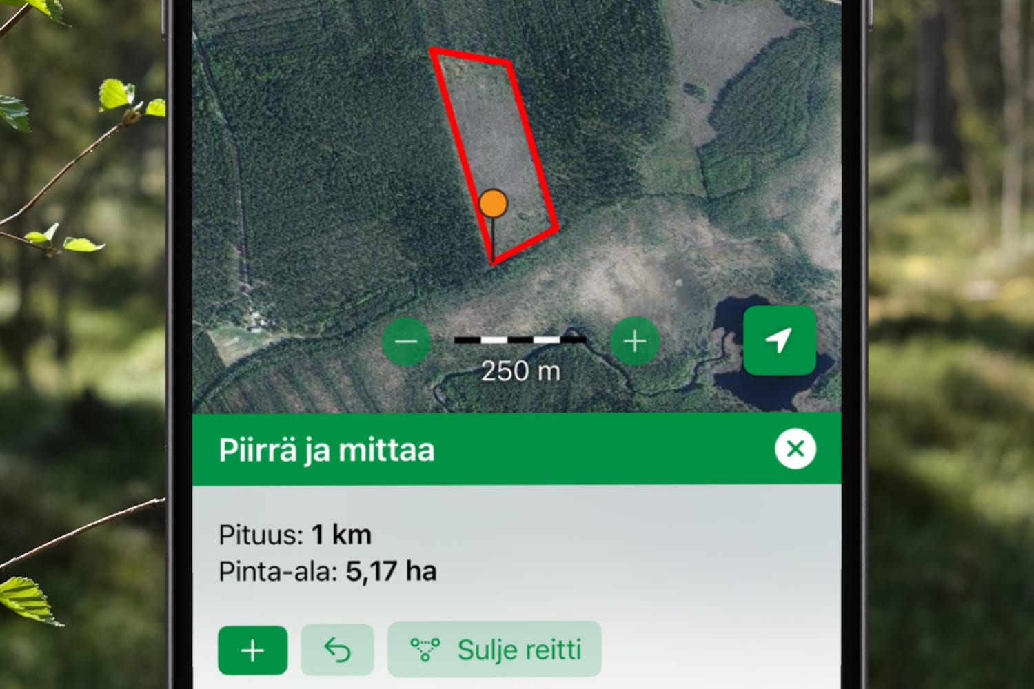 Kun käytössäsi on Karttaselaimen Plus-tilaus, voit tarkastella piirretyn alueen tai nauhoitetun reitin pinta-alaa. Pinta-alan mittaamiseksi reitin ensimmäinen ja viimeinen piste yhdistetään automaattisesti. Jotta pinta-ala voidaan laskea oikein, tulee kuljetun reitin sisälle jäädä vain yksi suljettu alue. Nauhoitetun reitin pinta-alan näet avaamalla nauhoitetun reitin tiedot Paikat ja reitit -valikosta tai napauttamalla nauhoitettua reittiä kartalla. Lue lisää toiminnosta verkkosivultamme.