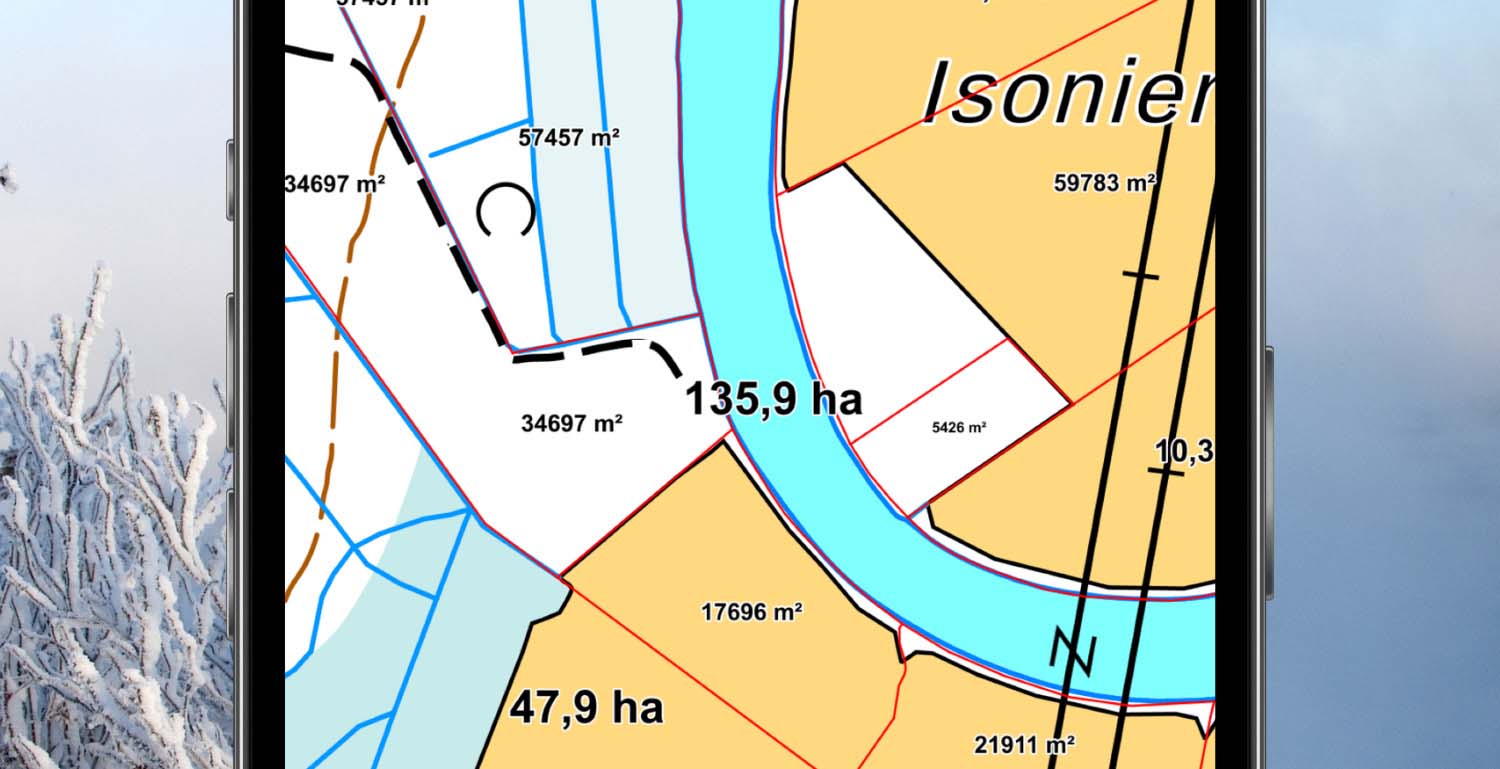 Kun käytössäsi on Plus-tilaus, voit kytkeä karttavalikosta käyttöön Kiinteistöjen pinta-alat -karttatason, joka näyttää kiinteistöjen palstakohtaiset pinta-alat selkeästi kartalla. Plus-tilauksen avulla voit myös hakea kiinteistöjä kiinteistötunnuksella käyttäen sovelluksen hakutoimintoa ja saat käyttöösi täysin ajantasaiset suoraan kiinteistörekisteristä tulevat kiinteistötiedot. Lue lisää toiminnosta verkkosivuiltamme.