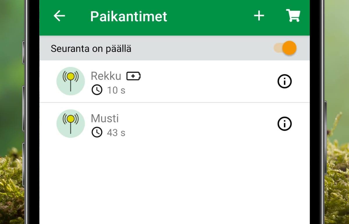 Yhdistämällä yhteensopivan GPS-paikantimen Karttaselaimeen voit seurata paikantimen sijaintia Karttaselaimen huipputarkoilla kartoilla niin maastossa, vesillä kuin kaupungissa. Toiminto on käytettävissä Plus-tilauksella ja soveltuu erinomaisesti vaikkapa lemmikin tai yhteiskäyttöisen ajoneuvon seurantaan. Lue lisää Karttaselain Plus -tilauksessa käytettävistä paikantimista verkkosivuiltamme.