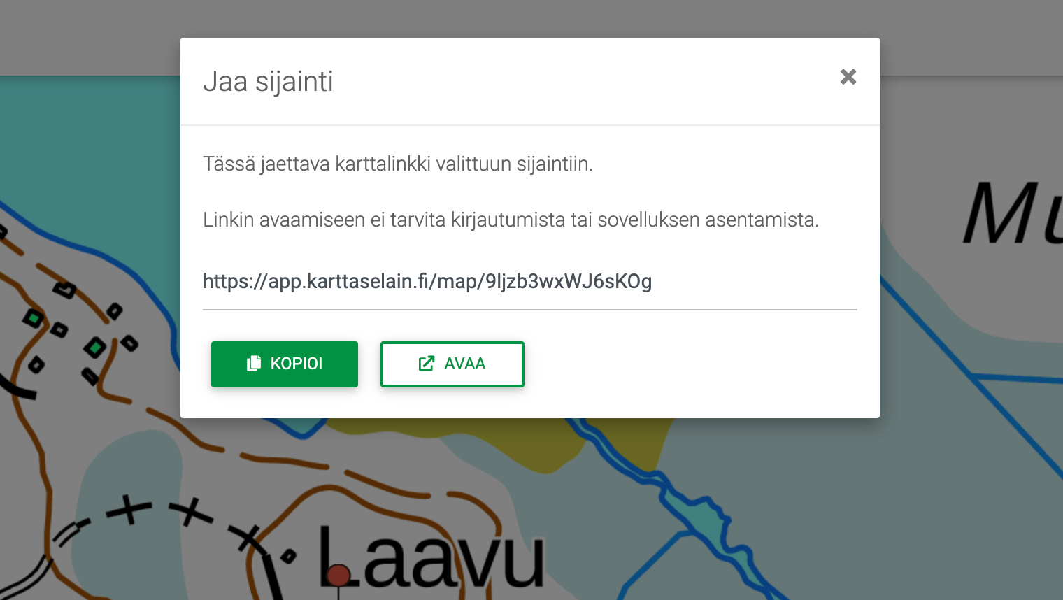 Isommalla porukalla liikuttaessa sijainninjakaminen muille seurueen jäsenille voi usein olla tarpeellista, jos osa porukasta jää syystä tai toisesta muusta ryhmästä kauemmaksi. Uudella sijainninjako-toiminnolla voit helposti jakaa sijainnin seurueen muille jäsenille yhden linkin avulla. Linkki avautuu painalluksen jälkeen Karttaselaimen web-versioon, jossa näet erillisen tietoikkunan jaettua linkkiä koskien. Ikkunasta löydät jaetun kohteen WGS84-koordinaatit, kulkuohjeet jaettuun sijaintiin sekä mahdollisuuden piilottaa jaetun merkinnän kartalta.