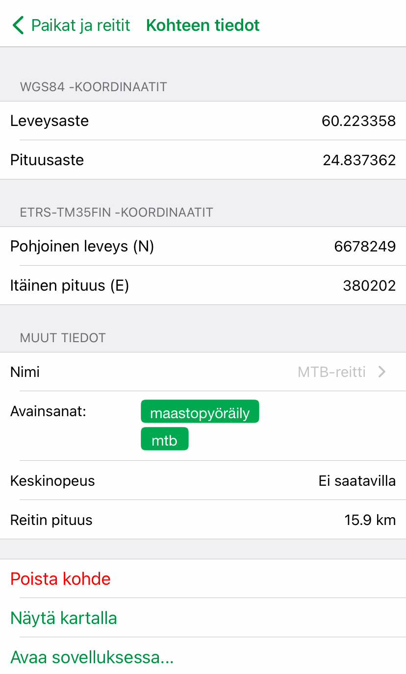 - Reitin lähtöpisteen koordinaateista (WGS84 & ETRS-TM35FIN)