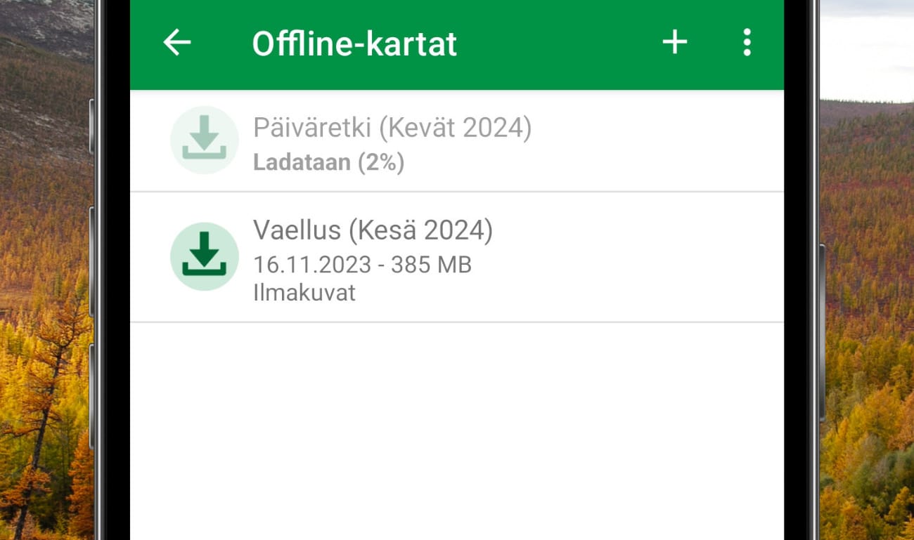 Lataa tarvitsemasi kartat offline-tilaan Plus-tilausversion avulla, jolloin voit selailla tarvitsemiasi karttoja ilman verkkoyhteyttä. Offline-lataustoiminto on käytettävissä Karttaselaimen Android- ja iOS-versiossa. Lue lisää Karttaselain Plus -tilausversion offline-kartoista verkkosivuiltamme.