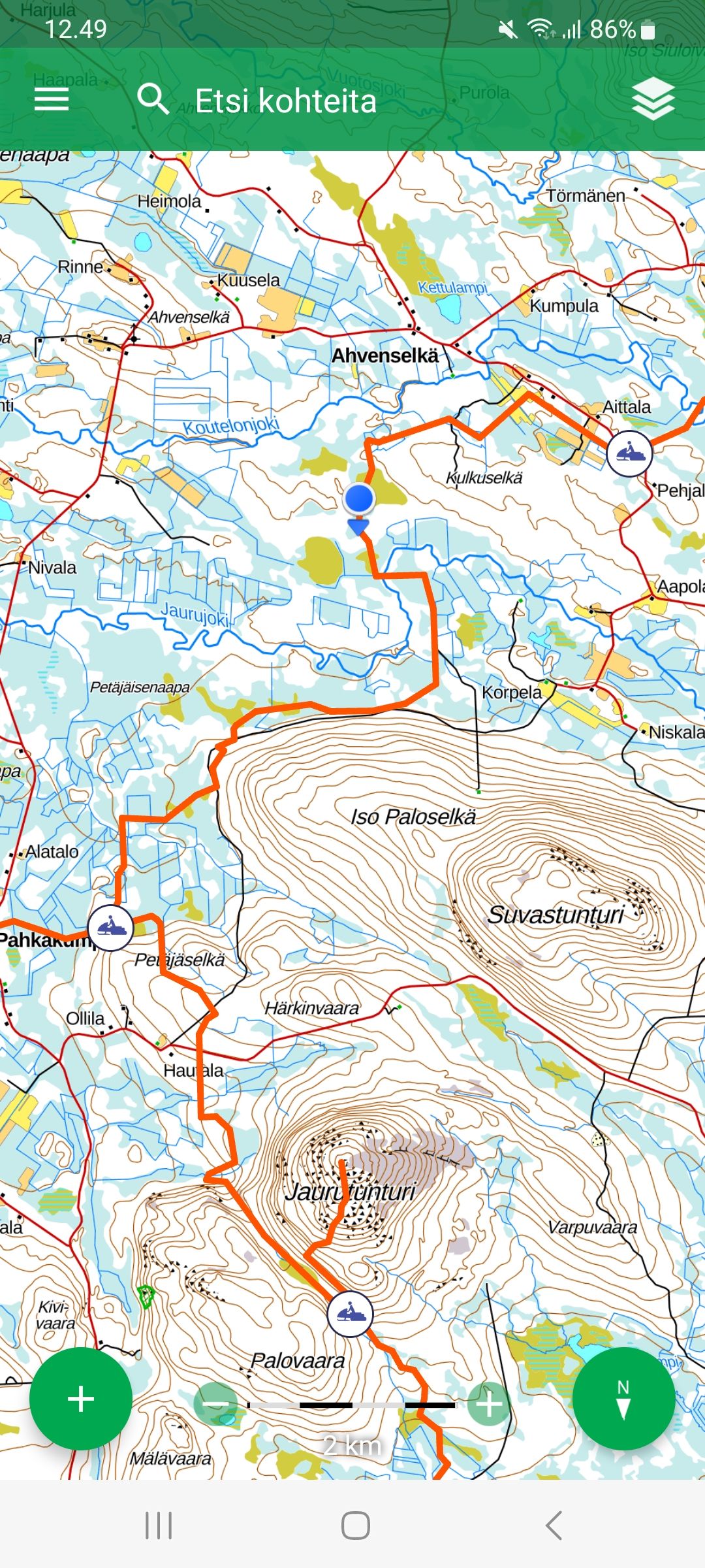 Haluatko tallentaa moottorikelkalla kulkemasi reitin ja jälkikäteen tarkastella muun muassa reittisi pituutta sekä keskinopeutta? Tämä onnistuu Karttaselaimen mobiiliversiossa "Nauhoita reitti" -toiminnolla, joka löytyy karttanäkymässä alhaalta löytyvän + -painikkeen kautta. Kun nauhoitus on aktiivisena, sovellus tallentaa mobiililaitteen kulkeman reitin, matkan, ajan sekä keskinopeuden. Tallennuksen voi katkaista ruudulla näkyvästä punaisesta painikkeesta, jonka jälkeen reitti siirtyy tarkasteltavaksi päävalikon kautta löytyvän "Paikat ja reitit" -valikon "Reitit" -välilehdelle.