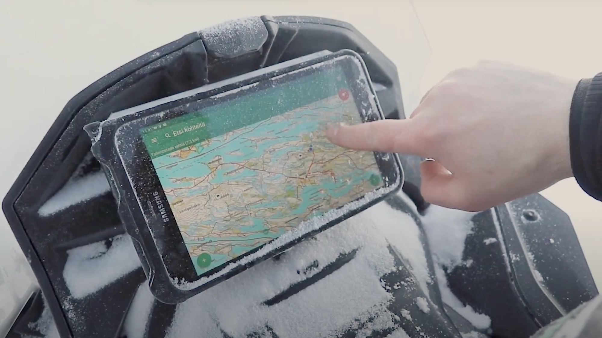 - Näyttää moottorikelkan sijainnin ja nopeuden karttapohjalla