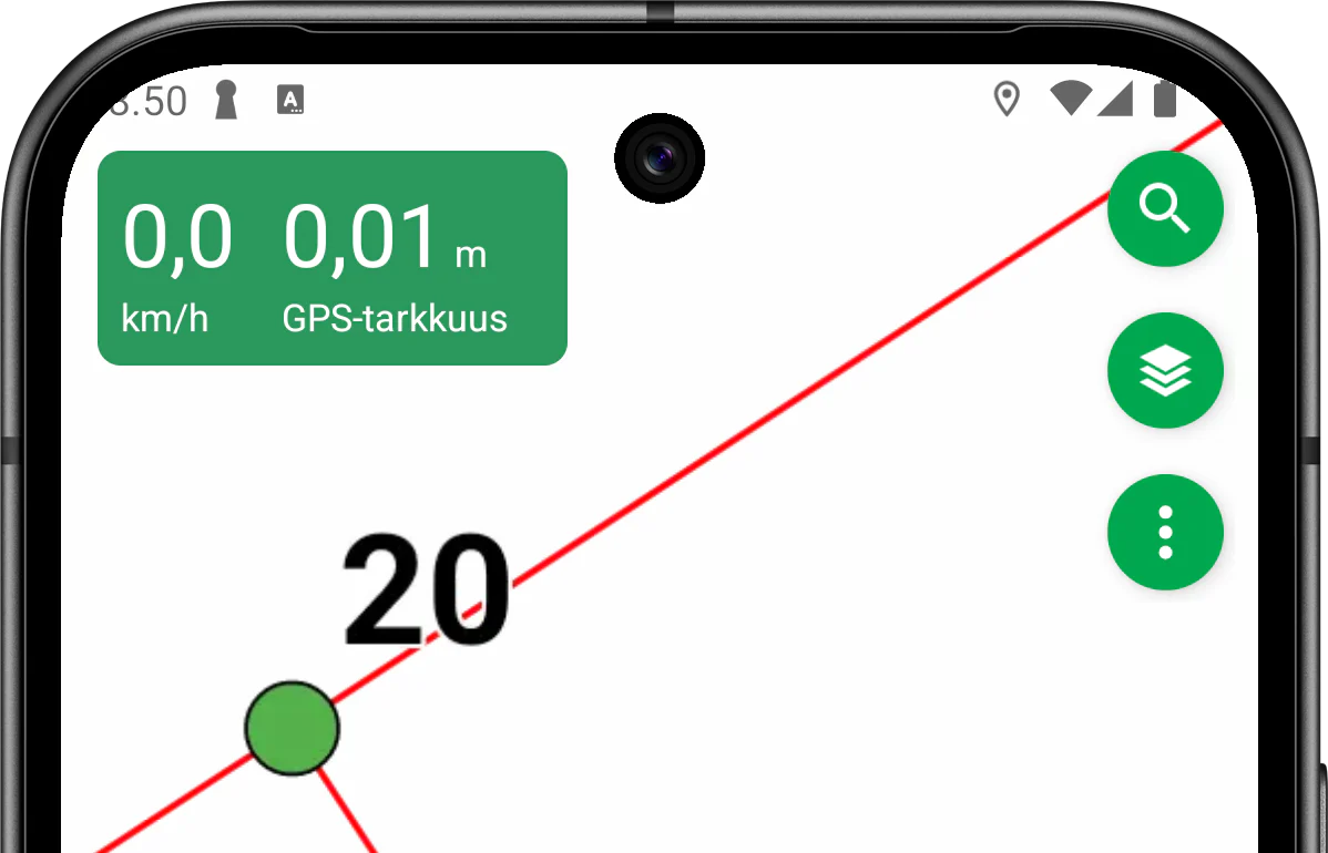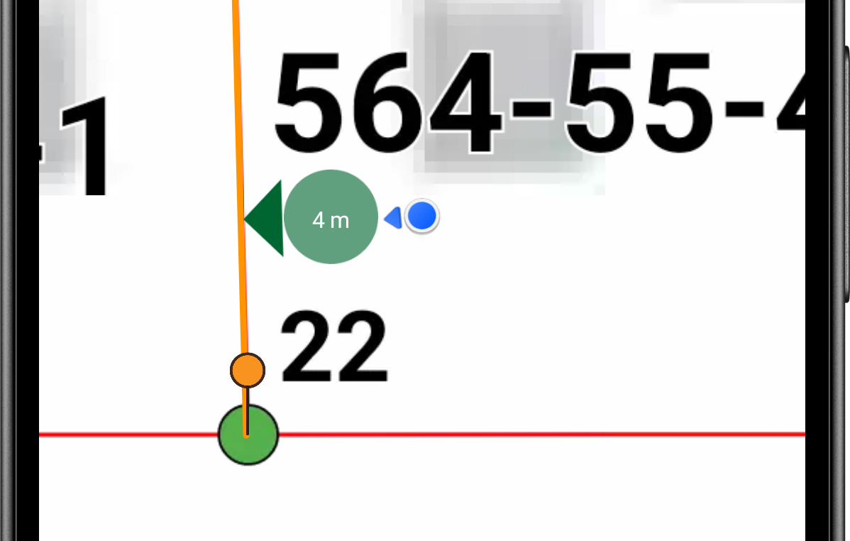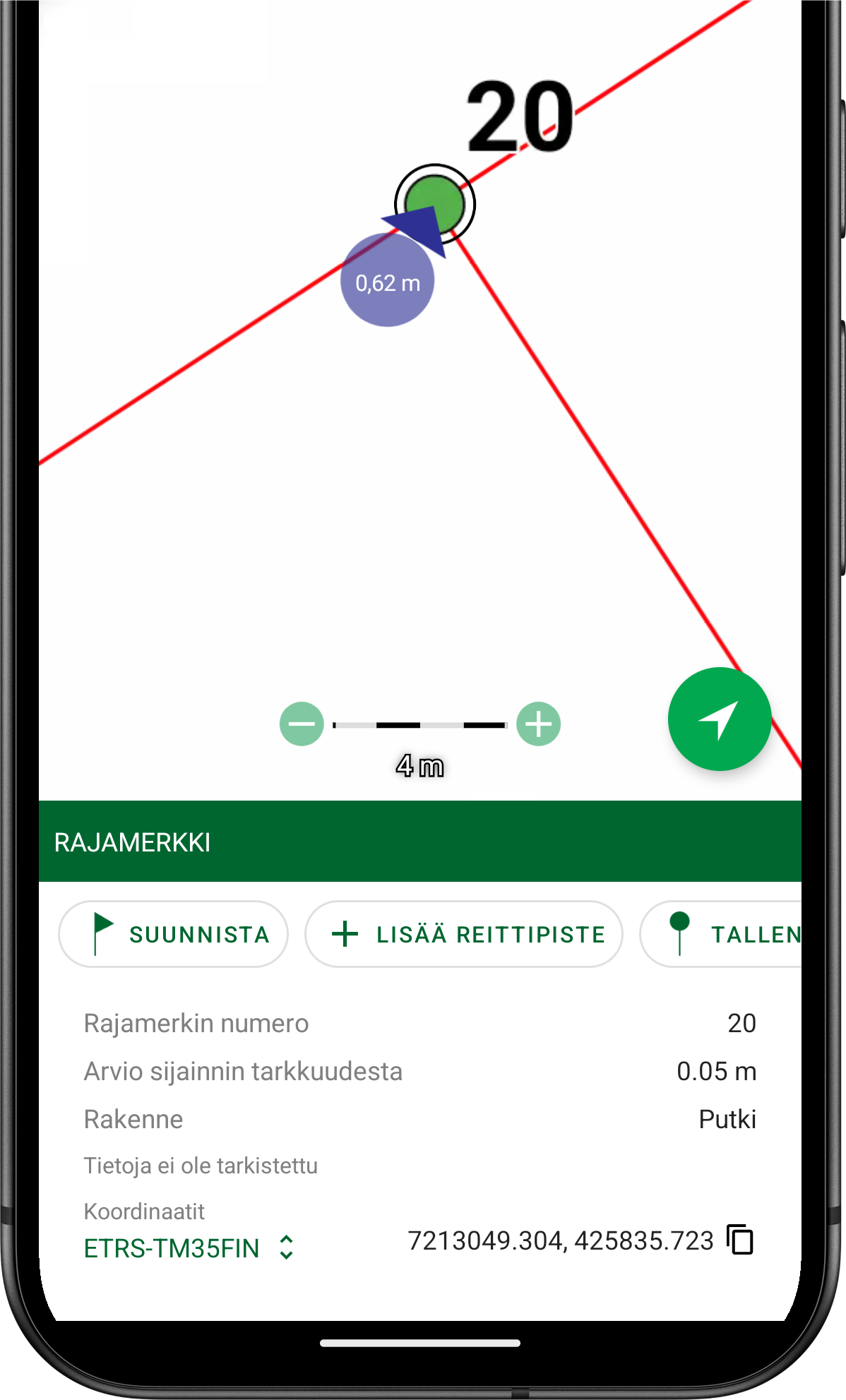 Linjalle, kuten vaikkapa kiinteistörajalle navigointi onnistuu piirtämällä reitti kartalle, minkä jälkeen voit napauttaa reitin tiedoissa painiketta Seuraa reittiä. Tämän jälkeen keskitä kartta omaan sijaintiisi oikean alareunan nuolipainikeella, jolloin näet etäisyyden omasta sijainnistasi linjaan.